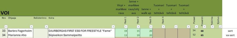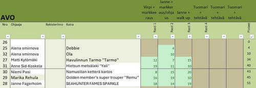 Luokkakohtaiset yksilötulokset on kuvissa. Paljon onnea hyviä tuloksia saaneille ja treeni-intoa kaikille! Hanhenpää-kiertopalkinnon (hävinneen joukkueen paras AVO-luokan koira) meni Namusillan Ketterälle Karlokselle, ohj Pasi Niemi.